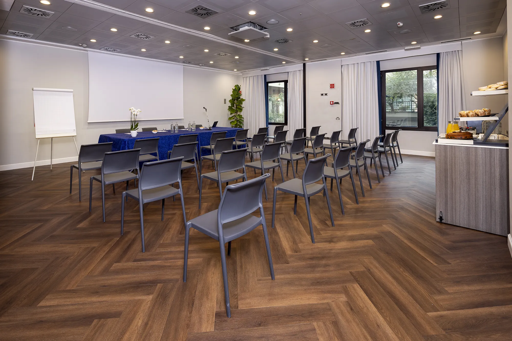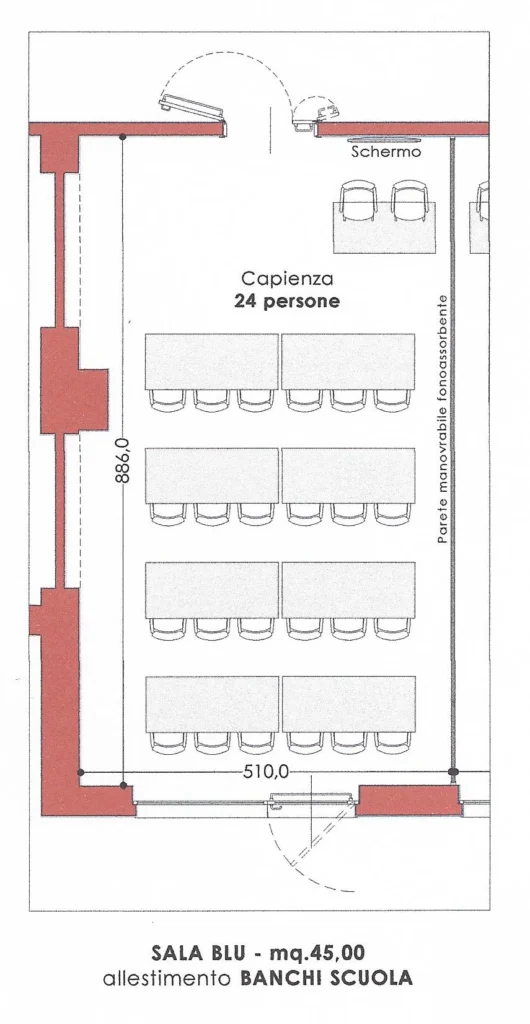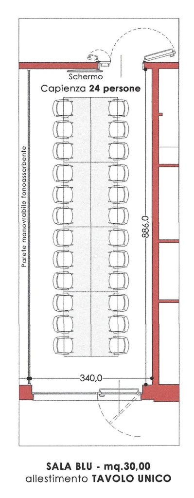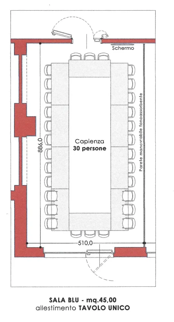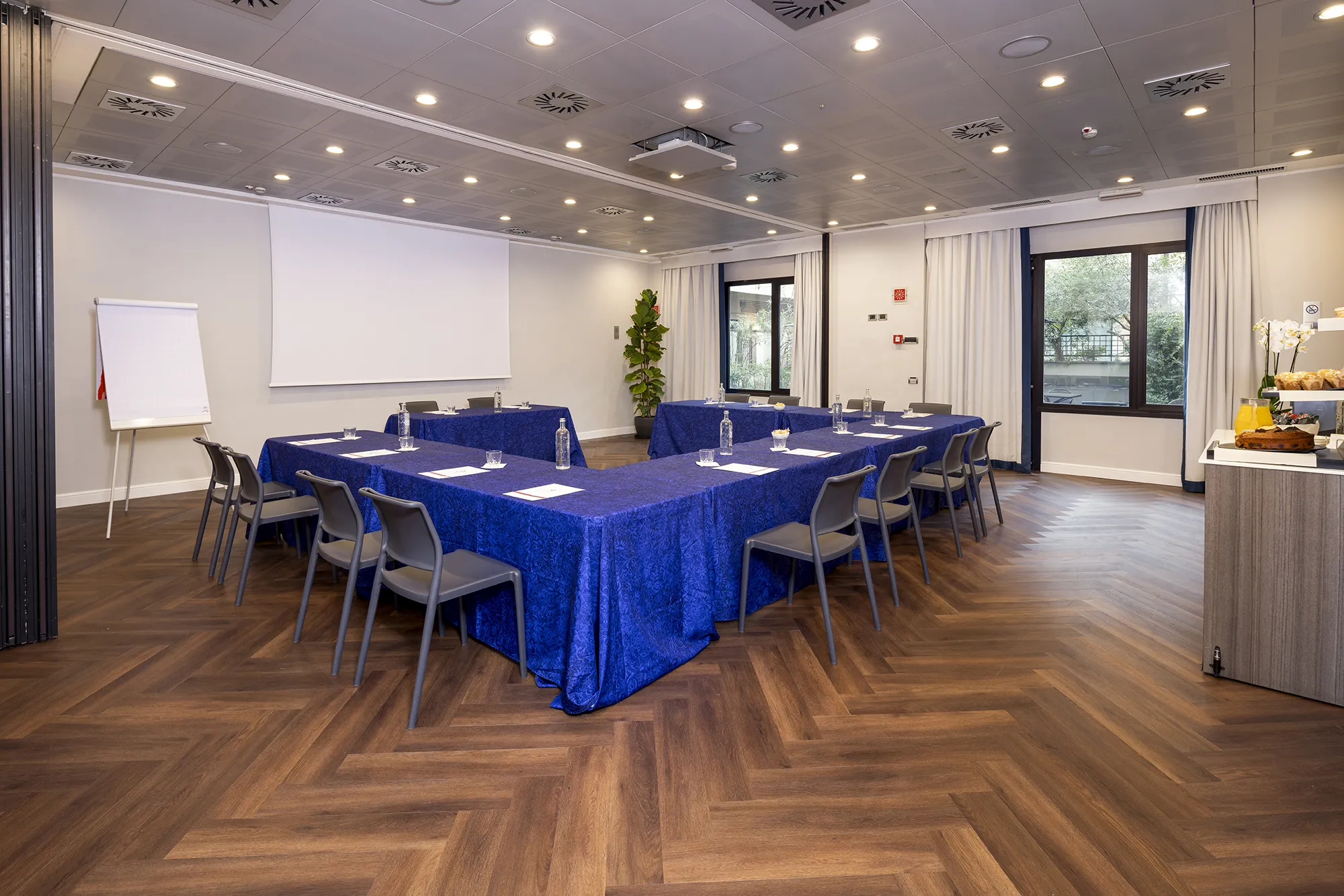 The moving, soundproof wall divides the room into two independent rooms, each with its own sound system, high-definition projection, heating and air conditioning. The independently zoned lighting system does not strain the eyes, and the high-definition video projection and sound system facilitate the success of your meetings.