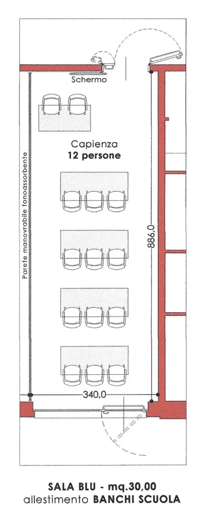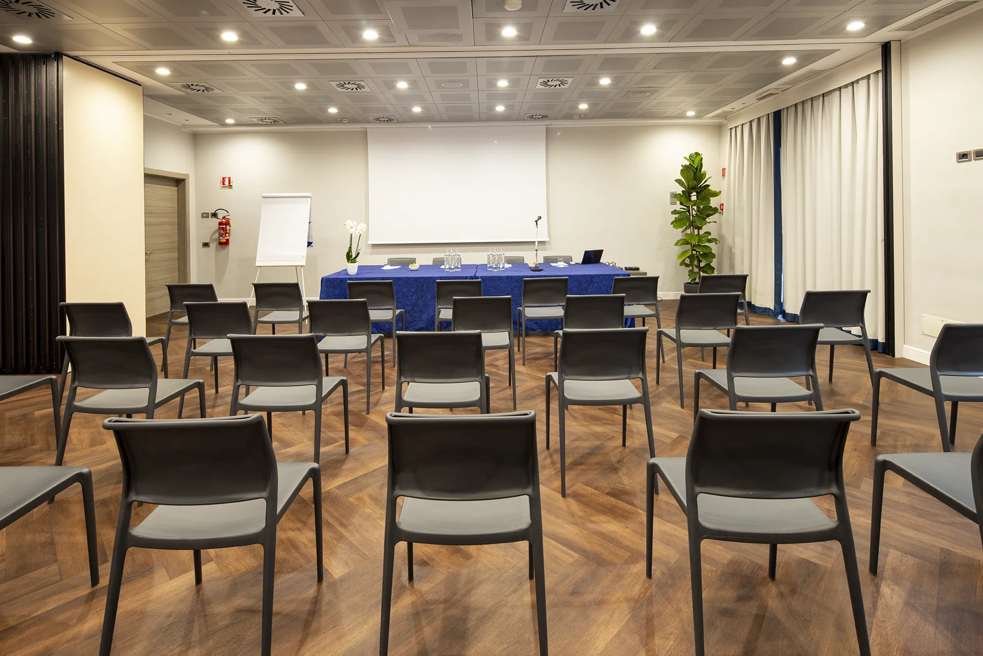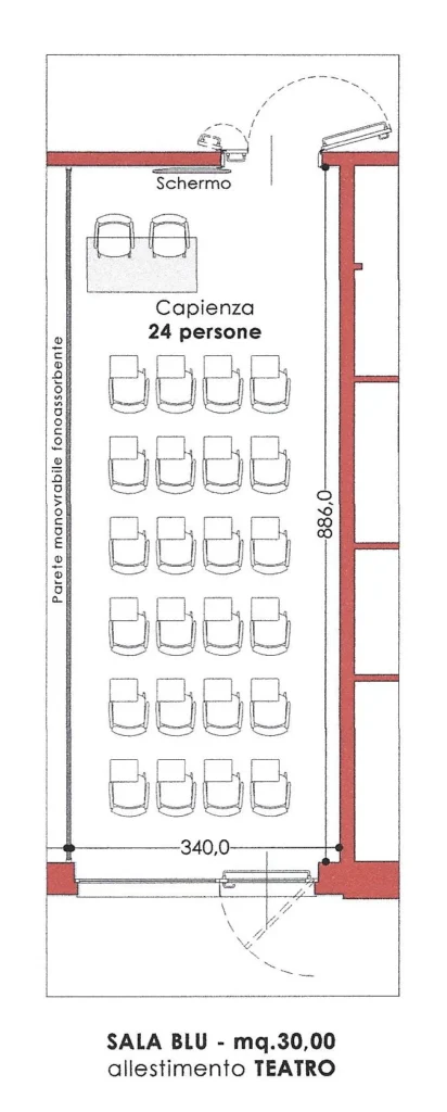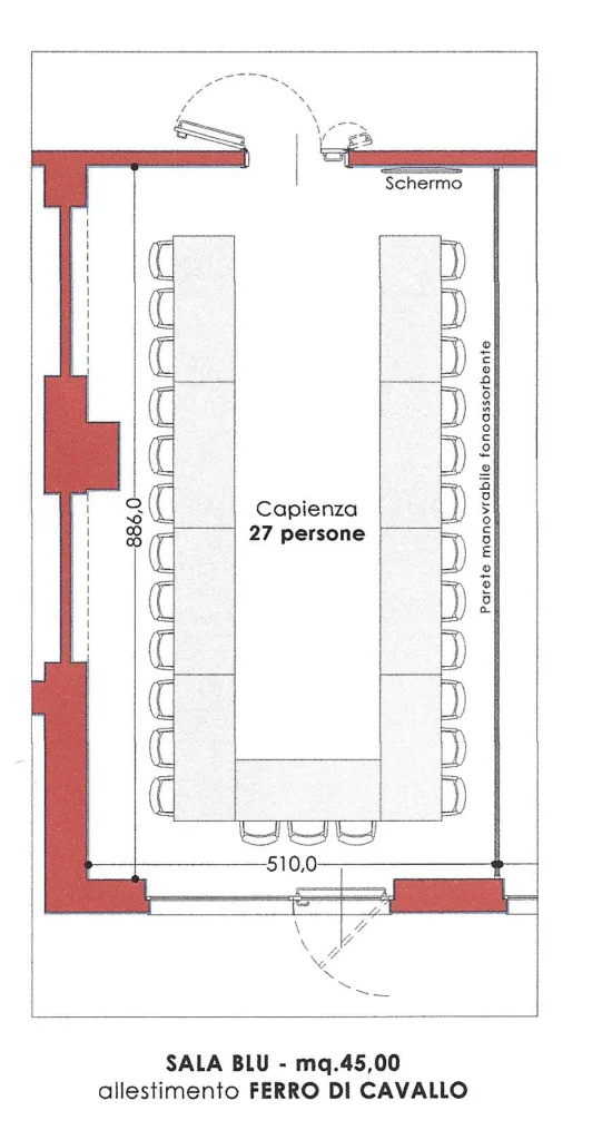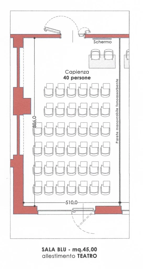 The moving, soundproof wall divides the room into two independent rooms, each with its own sound system, high-definition projection, heating and air conditioning. The independently zoned lighting system does not strain the eyes, and the high-definition video projection and sound system facilitate the success of your meetings.